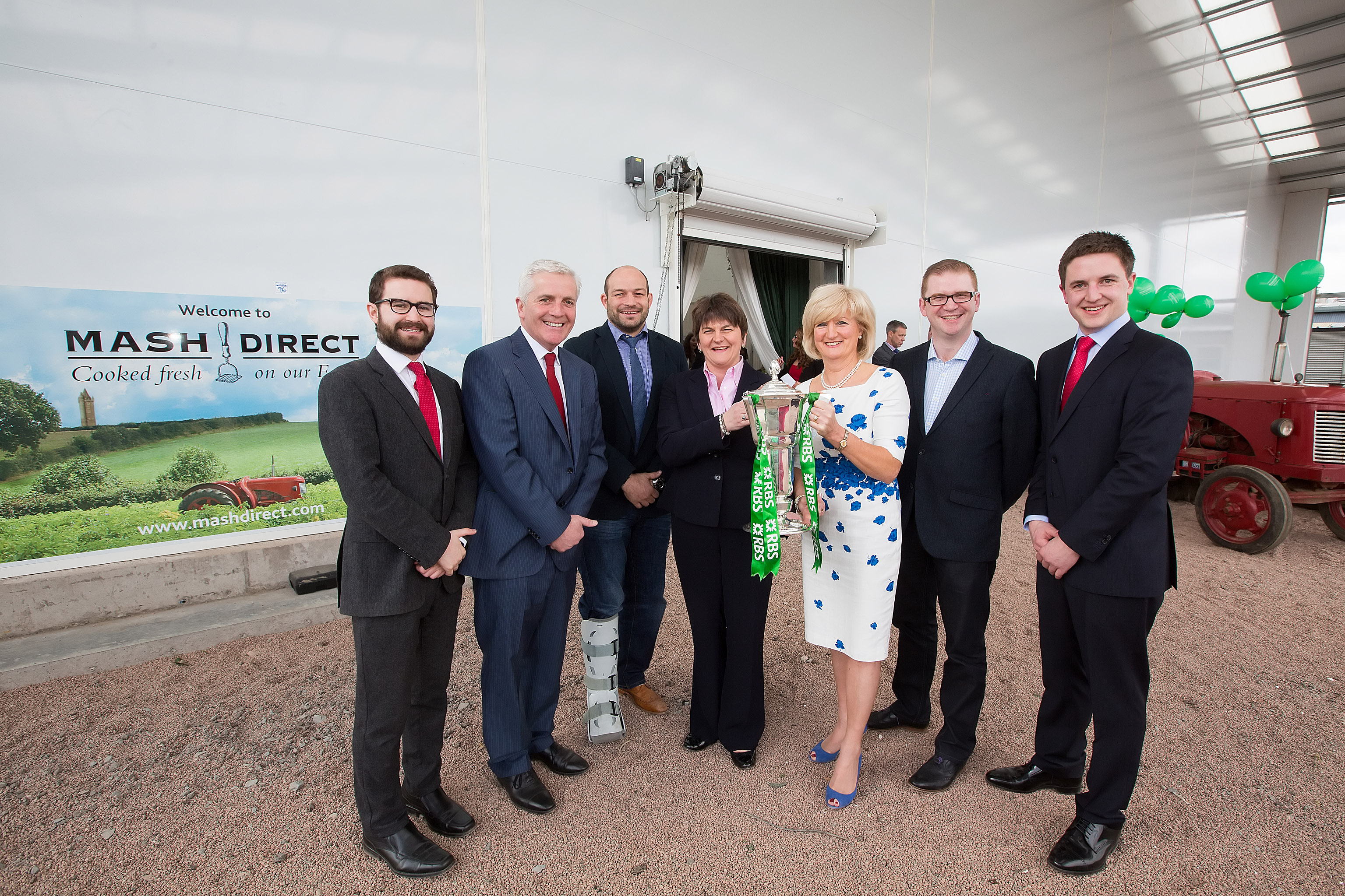 Photo Caption: L-R: Jack Hamilton (Director, Mash Direct), Martin Hamilton (Founder and Managing Director, Mash Direct), Rory Best (Ulster/Ireland Rugby Star), Arlene Foster (Minister of Enterprise), Tracy Hamilton (Director, Mash Direct), Simon Hamilton (Minister of Finance) and Lance Hamilton (Sales Director, Mash Direct) celebrate Mash Direct’s 10th year in business. Rory Best brought the six nations trophy along to Mash Direct’s celebratory event.