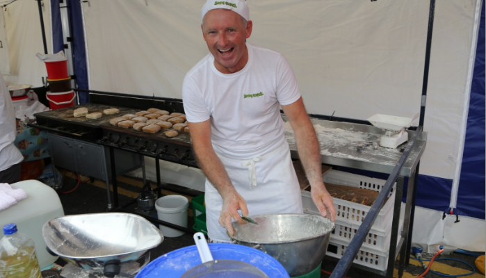 He turns up with his ready-made stall and cranks into action. He came up with the ideas after visiting scores of markets on city breaks over the years. He saw bread being brought into markets and wondered why it couldn’t be made on site, so now he does!