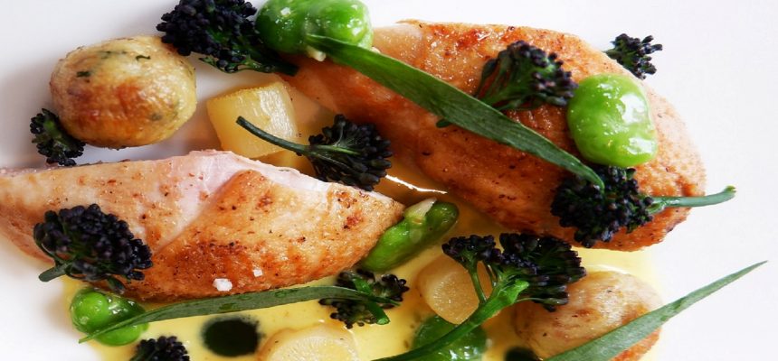 It uses quail, a small, poultry like bird that we get from a small artisan producer, Sebastian McMichael based in County Antrim. The dish itself is one of the more popular offerings on the menu and is highly rated among our guests. It comprises of quail breasts, dumplings made from the legs and potato, spring vegetables and a mustard sauce.